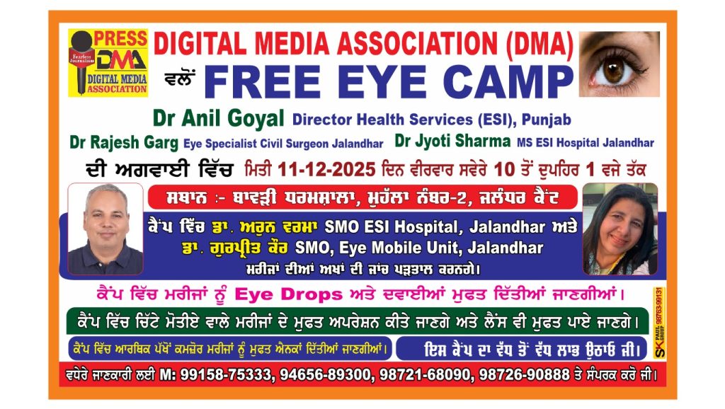 Digital Media Association (DMA) ਵਲੋਂ 11 ਦਸੰਬਰ ਨੂੰ ਜਲੰਧਰ ਕੈਂਟ ਵਿਖੇ ਲਗਾਇਆ ਜਾ ਰਿਹਾ “ਅੱਖਾਂ ਦਾ ਮੁਫ਼ਤ ਮੈਡੀਕਲ ਕੈਂਪ