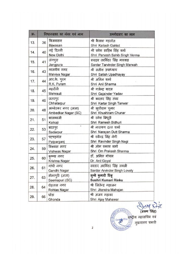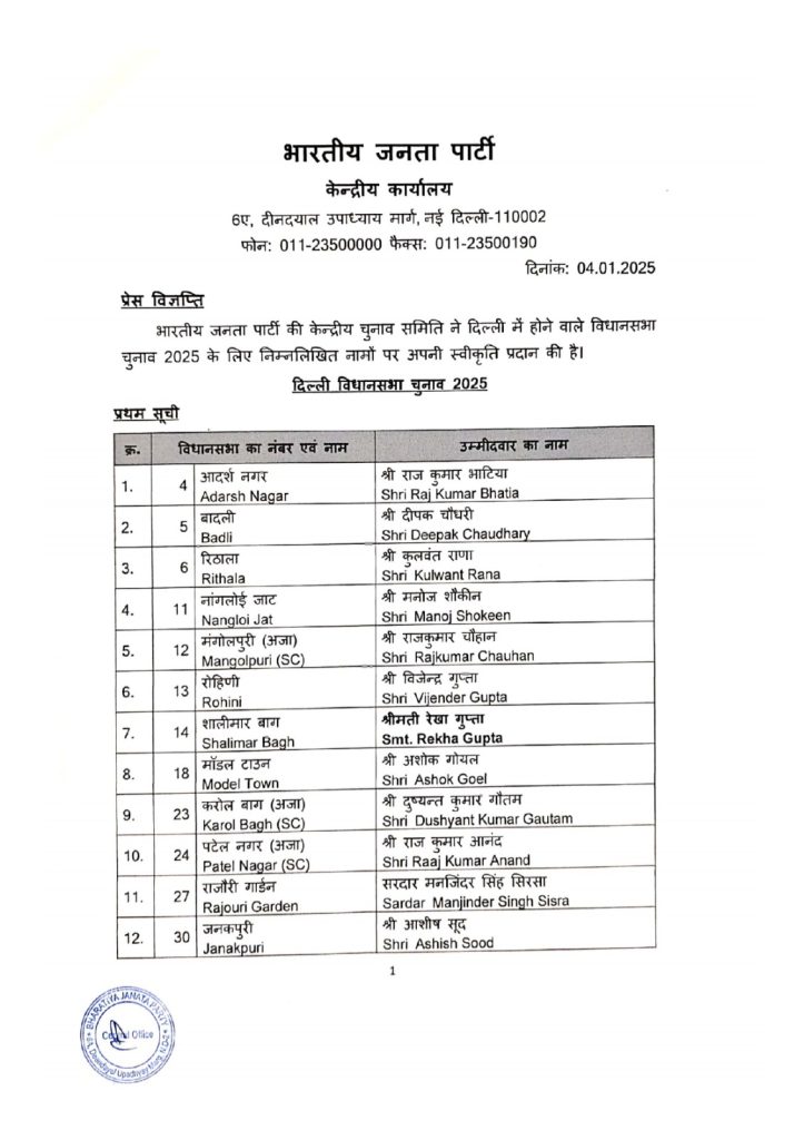 नई दिल्ली : आगामी दिल्ली विधानसभा चुनावों को ध्यान में रखते हुए भारतीय जनता पार्टी (भाजपा) ने अपनी पहली उम्मीदवार सूची जारी की है। पार्टी ने कुल 29 उम्मेदवारों को दिल्ली के विभिन्न निर्वाचन क्षेत्रों से चुनाव लड़ने के लिए नामित किया है।