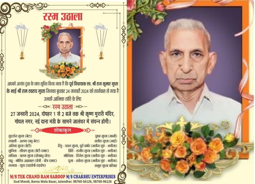 MBD NEWS: जालंधर : पूर्व विधायक स्वर्गीय राज कुमार गुप्ता के भाई श्री राम स्वरूप गुप्ता का बुधवार 24 जनवरी 2024 को निधन हो गया था। उन की आत्मिक शांति के लिए 27 जनवरी दोपहर 1 से 2 बजे तक श्री कृष्ण मुरारी मंदिर गोपाल नगर जालंधर में सम्पन्न होगी।