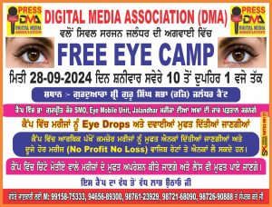 MBD NEWS ਜਲੰਧਰ ਕੈਂਟ :- ਸਮੁੱਚੀ ਮਨੁੱਖਤਾ ਦੀ ਸੇਵਾ ਨੂੰ ਸਮਰਪਿਤ ਪੱਤਰਕਾਰਾਂ ਦੀ ਮੋਹਰੀ ਸੰਸਥਾ ਡਿਜੀਟਲ ਮੀਡੀਆ ਐਸੋਸੀਏਸ਼ਨ (DMA) ਵਲੋਂ ਸਿਵਲ ਸਰਜਨ ਜਲੰਧਰ ਡਾ. ਗੁਰਮੀਤ ਲਾਲ ਜੀ ਦੀ ਅਗਵਾਈ ਹੇਠ 28 ਸਤੰਬਰ, ਦਿਨ ਸ਼ਨੀਵਾਰ ਨੂੰ ਗੁਰਦੁਆਰਾ ਸ਼੍ਰੀ ਗੁਰੂ ਸਿੰਘ ਸਭਾ (ਰਜਿ.) ਜਲੰਧਰ ਛਾਉਣੀ ਵਿਖੇ “ਅੱਖਾਂ ਦਾ ਮੁਫਤ ਕੈਂਪ” ਲਗਾਇਆ ਗਿਆ। ਜਿਸ ਵਿੱਚ ਨਗਰ ਵਾਸੀਆਂ ਨੇ ਵੱਡੀ ਗਿਣਤੀ ਵਿੱਚ ਸ਼ਾਮਲ ਹੋ ਕੇ ਇਸ ਕੈਂਪ ਦਾ ਲਾਭ ਲਿਆ।