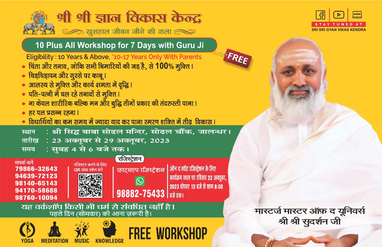MBD WEB NEWS जालंधर (सुमेश शर्मा) : Free Yoga Class : श्री श्री ज्ञान विकास केंद्र की तरफ से सात दिवसीय फ्री योगा व मैडिटेशन वर्कशॉप का आयोजन किया जा रहा है। ये सात दिवसीय वर्कशॉप जालंधर के श्री बाबा सोढल मंदिर के हाल में 23 से 29 अक्तूबर तक करवाई जाएगी। वर्कशॉप का समय सुबह 4 से 6 बजे तक है। इस वर्कशॉप में मास्टरज मास्टर ऑफ यूनिवर्स श्री श्री सुदर्शन जी साधकों को खुशहाल जीवन जीने की कला सिखाएंगे। अगर आप इस वर्कशॉप का हिस्सा बनना चहते हैं तो आपका इस वर्कशॉप में सोमवार को आना जरुरी है।